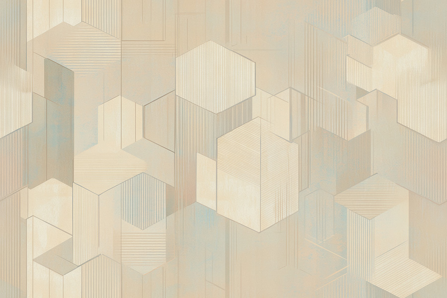 Silent Relief showcases a sculptural arrangement of geometric blocks—cubes, pyramids, and trapezoids—highlighted by delicate engraved lines. The design is inspired by architectural reliefs and stone inlay work, creating embossed forms that seem to float gently on a soft, minimalist backdrop. The color palette, with its cream and beige hues, evokes a sense of calm sophistication. The subdued contrast and tactile textures ensure that the design creates a serene ambiance, making it an ideal choice for modern, high-end interiors.