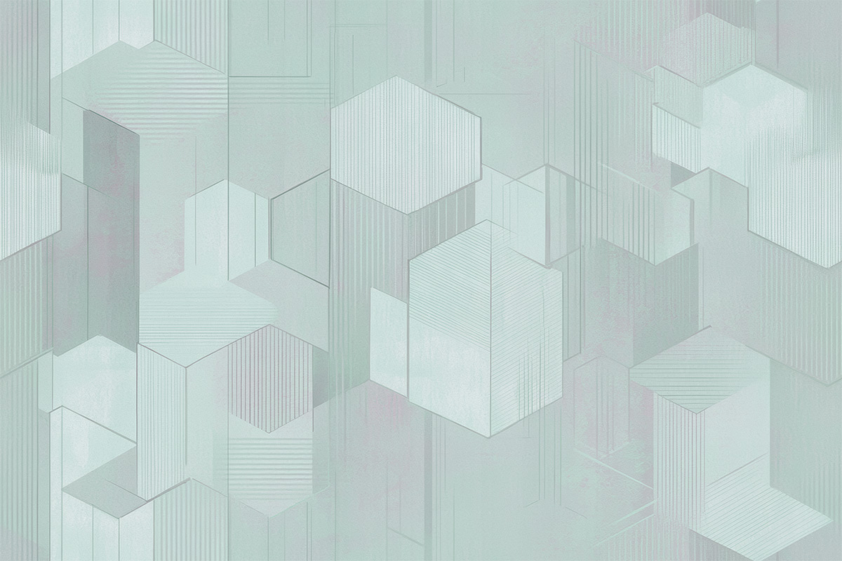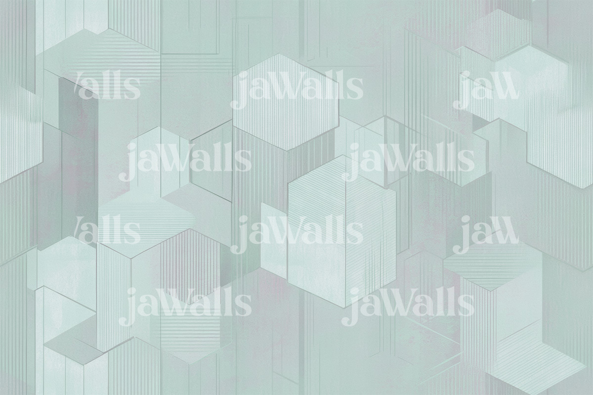 Silent Relief in the Aqueous Echo variation blends mineral structure with the fluid harmony of water-inspired hues. The design features engraved geometric shapes—cubes, pyramids, and trapezoids—that seem to float gently against a muted aquamarine-turquoise backdrop. There’s a refined sense of balance in how form and color interact, producing a subtle illusion of depth without visual noise. This wallcovering is ideal for serene spaces such as spas, reading rooms, or sophisticated lounges where tranquility and texture play a leading role in atmosphere creation.