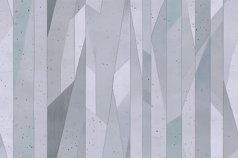 Ecliptic Array transforms architectural abstraction into a rhythmic landscape of sharp, rising forms. Diamonds and rectangles are stacked with intention, echoing a stylized skyline infused with textures like etched brass, fossil inlay, and ceramic matte. The pale hue breathes life into the rigid composition, resulting in a wallcovering that feels both meditative and assertive. Balanced between precision and softness, this design elevates interiors with sculptural nuance and timeless graphic power.