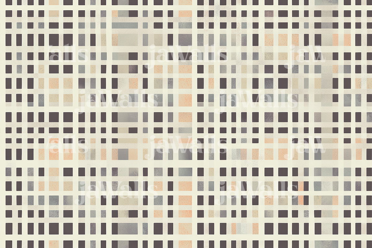 Gravitational Grid presents a digital design that merges precise, modular geometry with tactile, organic textures. The pattern features geometric shapes resembling architectural cutouts, carefully aligned in a grid structure. The neutral color palette, with its mixture of cement grey, rust, slate, and beige, brings a sophisticated earthiness to the design. The shading and lighting, carefully simulated, enhance the three-dimensional feel of the grid, while digital noise and texture give it a handcrafted touch. Gravitational Grid is a modern interpretation of industrial aesthetics, blending digital craftsmanship with natural warmth, perfect for spaces seeking a balance between the digital and the tactile.