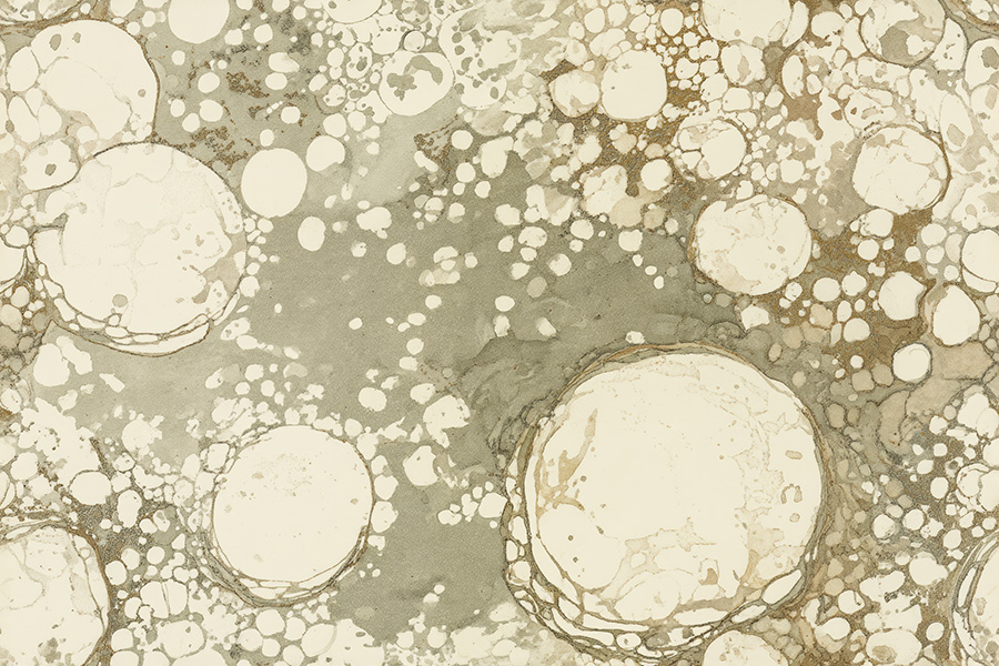 The Moss Canvas wallpaper design offers a serene and detailed exploration of natural textures, drawing inspiration from the delicate surfaces of dried mushroom caps and lichen-covered bark. The design features a captivating array of irregular circular and cellular formations that softly overlap, creating an organic rhythm that feels both natural and unique. The muted and earthy color palette, initially composed of off-whites, sage green, faded ochre, and soft clay, is now subtly unified by the gentle hues of bleached ochre. The surface appears matte and chalky, inviting a tactile curiosity, while sponge-like clusters introduce a gentle depth and a sense of subtle movement across the wall. This texture evokes the natural processes of decomposition and rebirth found on forest floors and in untouched wilderness, creating a meditative and quiet atmosphere that is both grounding and delicately intricate. It’s a celebration of the subtle beauty found in the natural world.