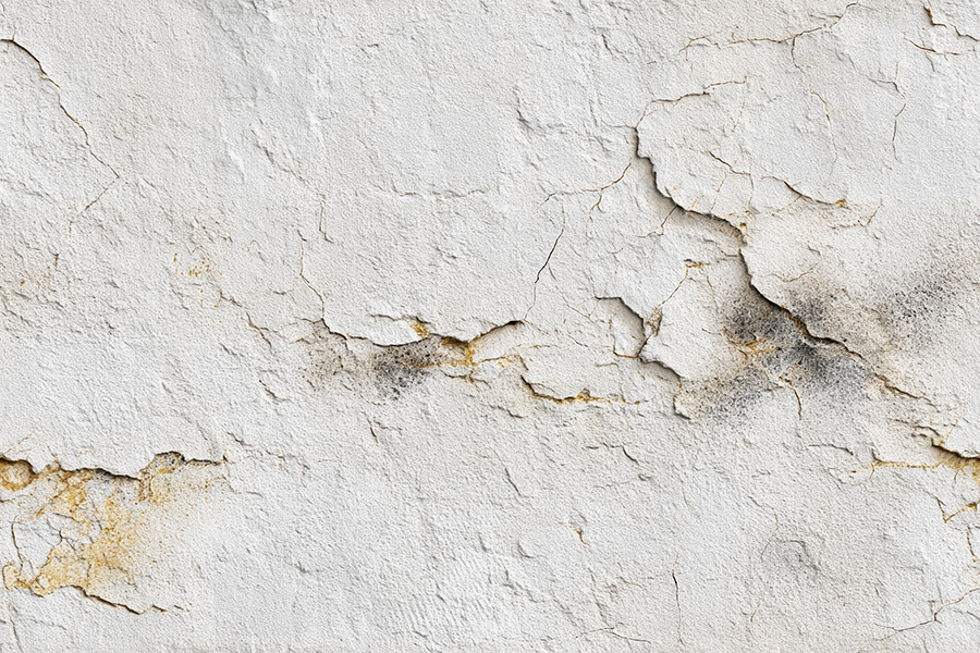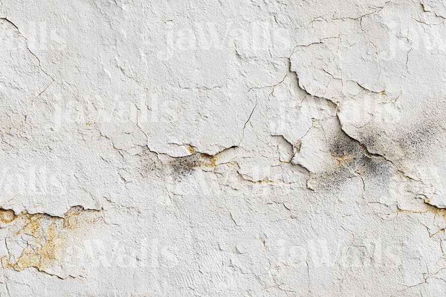 A continuous texture design emulating the surface of aged white concrete, marked by subtle fissures and areas of flaking paint that reveal a hint of underlying grey with fine gold-toned accents. The design captures the raw texture of cement, complete with the nuanced imperfections of time, offering a backdrop with subtle depth and a touch of understated luxury.