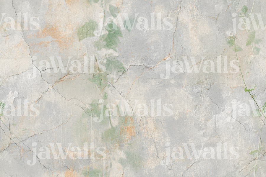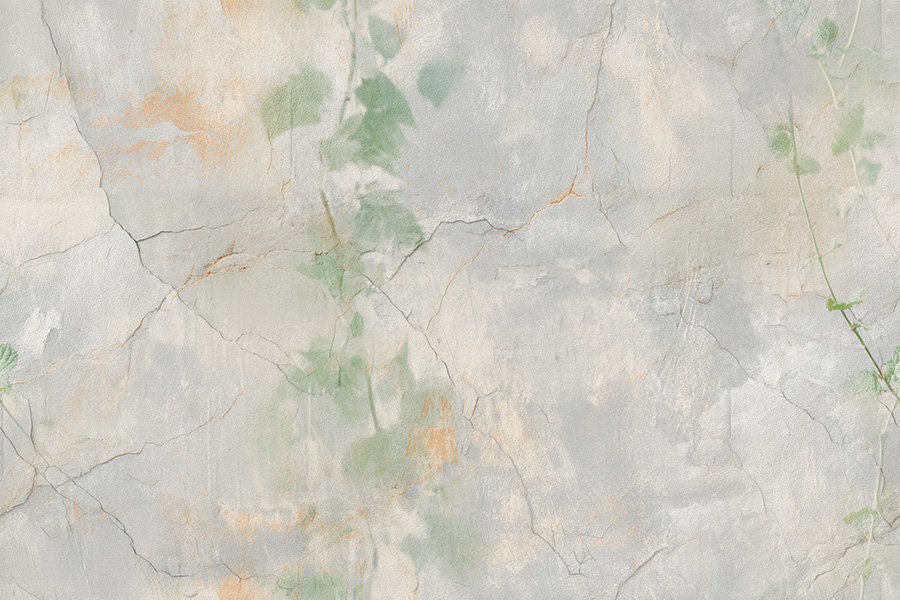 A continuous design featuring an ultra-realistic depiction of an old white brick wall with visible cracks from which delicate green plants emerge. The off-white background enhances the aged texture of the brick, creating a photographic effect that captures the intricate details of both the weathered wall and the vibrant greenery.