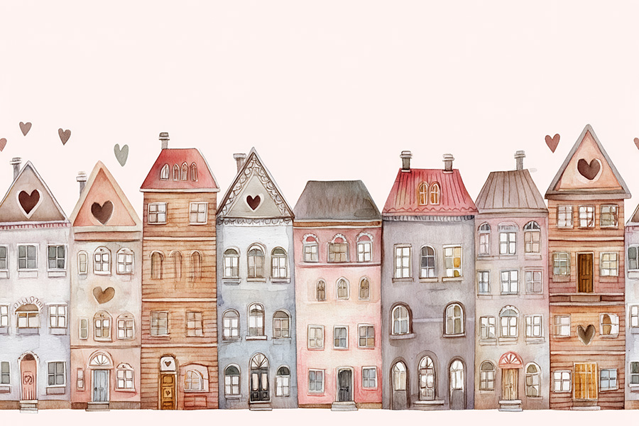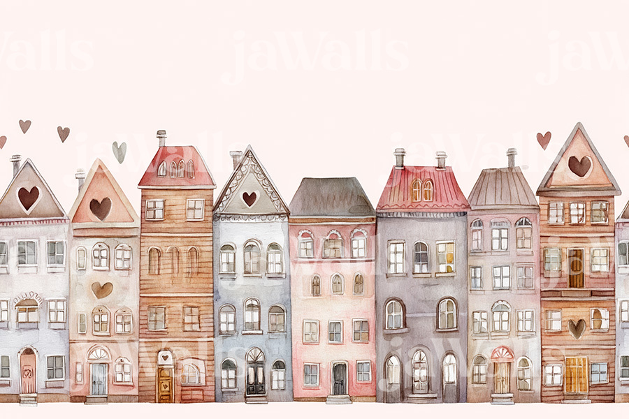 Tiny Tales taps into children's natural love for stories and discovery. Research shows that detailed, interactive wall designs stimulate cognitive development and creative thinking. The heart windows serve as focal points that encourage children to invent narratives about who might live in each home. Unlike flat, cartoonish patterns, this watercolor design offers depth and texture, creating a dynamic surface that changes appearance throughout the day as light shifts.