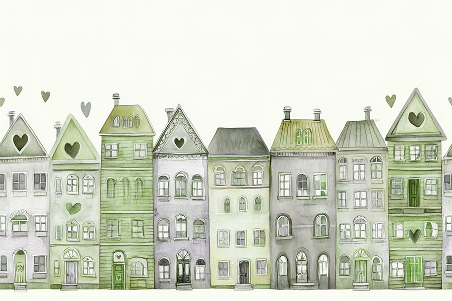 This green iteration of our beloved Tiny Tales design transforms children's spaces into peaceful havens. The Meadow Mist colorway wraps the charming houses in organic, earthy greens that evoke spring meadows and forest clearings. Unlike bright primary colors, this sophisticated palette promotes relaxation while maintaining the design's inherent playfulness. The heart-shaped windows pop subtly against the green backgrounds, inviting curiosity without overstimulation - perfect for creating balanced, nature-connected environments.