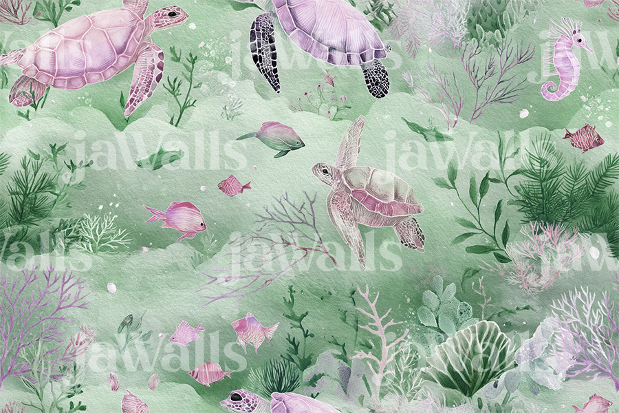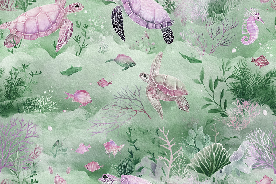 “Coral Drift” in the Garden Current variant blends the charm of marine life with the freshness of a blooming world. Its unique mix of greens and soft rose tones paints a surreal reef where underwater flora and fauna coexist in a watercolor embrace. Sea turtles and seahorses become part of a serene underwater garden, ideal for creating calming nursery environments. This mural gently guides little eyes and minds into a space of imagination and peaceful discovery.