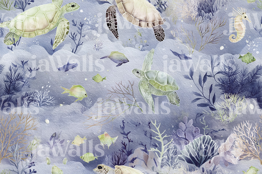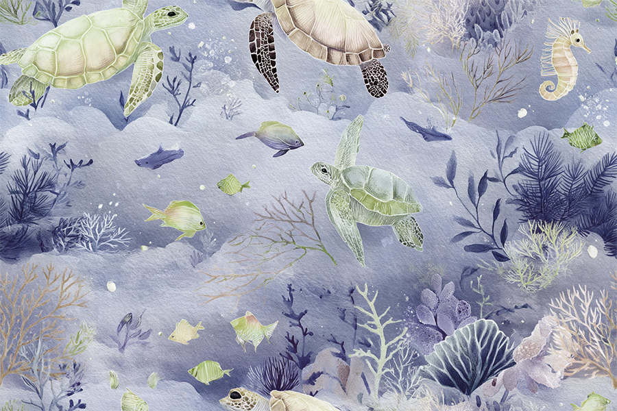 “Coral Drift” captures the gentle rhythm of life beneath the waves. In this watercolor dreamscape, sea turtles glide with grace, seahorses curl between coral fronds, and vibrant fish move like floating confetti. The design unfolds with fluid, pastel brushstrokes in hues of light blue, lending a tranquil sense of flow to the entire scene. Delicate and immersive, it transforms any wall into a quiet celebration of marine beauty—inviting children into an underwater world filled with gentle motion, color, and wonder. A poetic choice for nurseries and imaginative bedrooms alike.