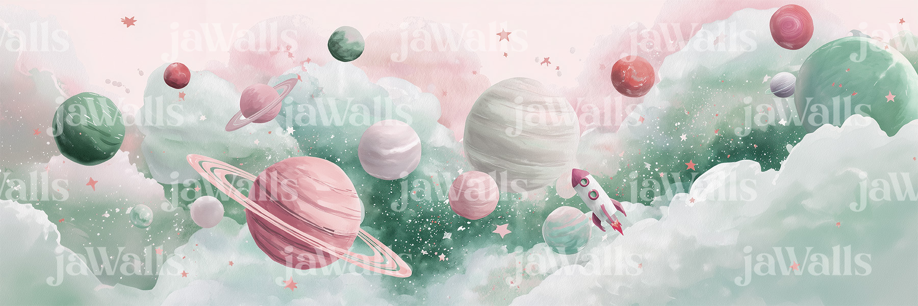 A dreamy watercolor cosmos where Saturn dominates the scene with its iconic rings, surrounded by drifting planets and twinkling stars. A tiny rocket sails through this celestial wonderland, its trajectory marked by a subtle trail of stardust. The composition balances astronomical wonder with child-friendly whimsy, making space exploration feel both magical and approachable.