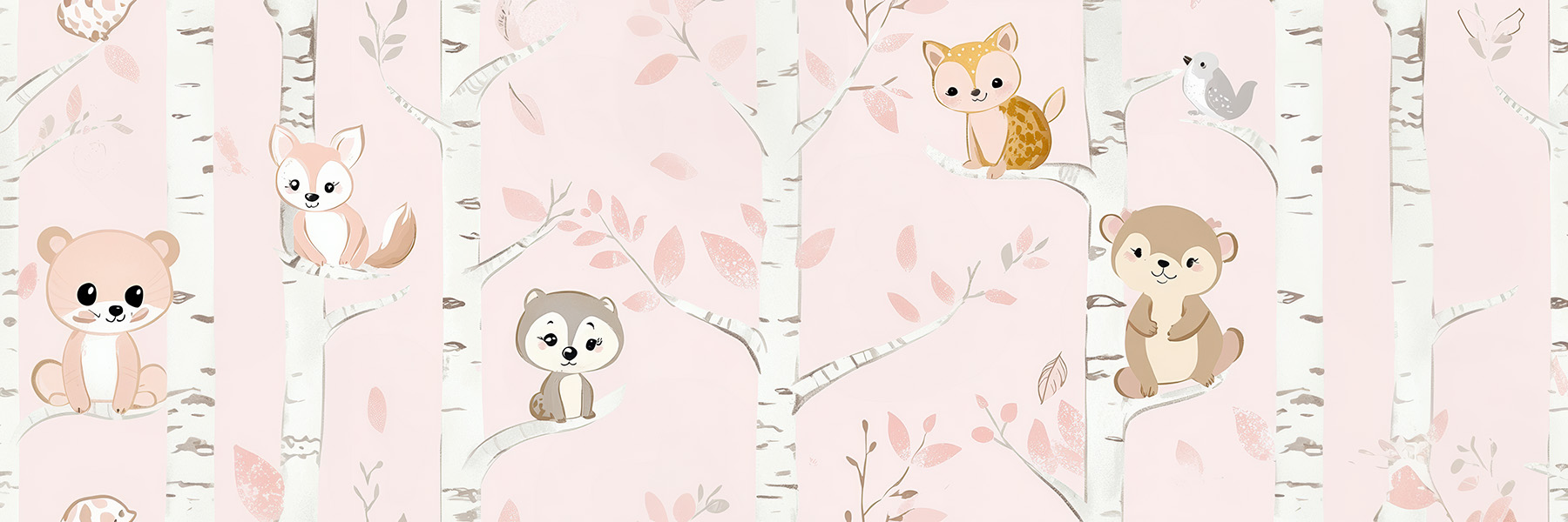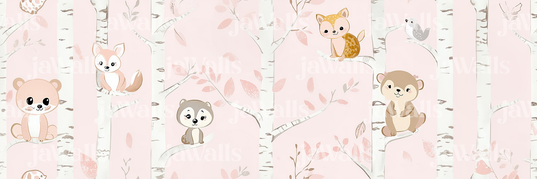 A magical woodland scene where birch trees twinkle with pastel pink glitter, housing adorable cartoon animals in sweet playful poses. The seamless vector pattern creates an enchanting forest full of movement and sparkle, perfect for adding fairy-tale charm to any nursery. Delicate glitter accents highlight the animals' cute features without overwhelming.