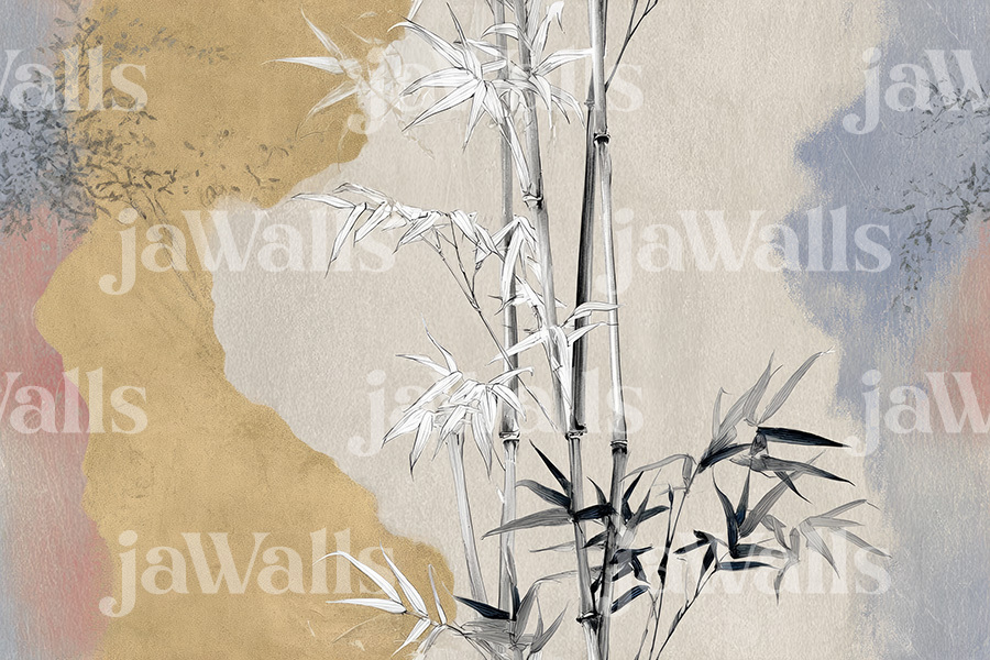 "Bamboo Scroll" is the perfect synthesis of tradition and modernity. Its minimalist forms and refined color palette make it versatile for any environment, from classic to contemporary. The golden leaves in the background create a play of light and depth, elevating the concept of abstract wallpaper. Perfect for high-end interiors that desire an atmosphere of serenity and sophistication. A true piece of wall art for spaces that speak of style and culture.