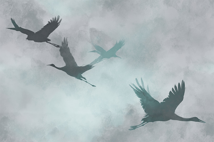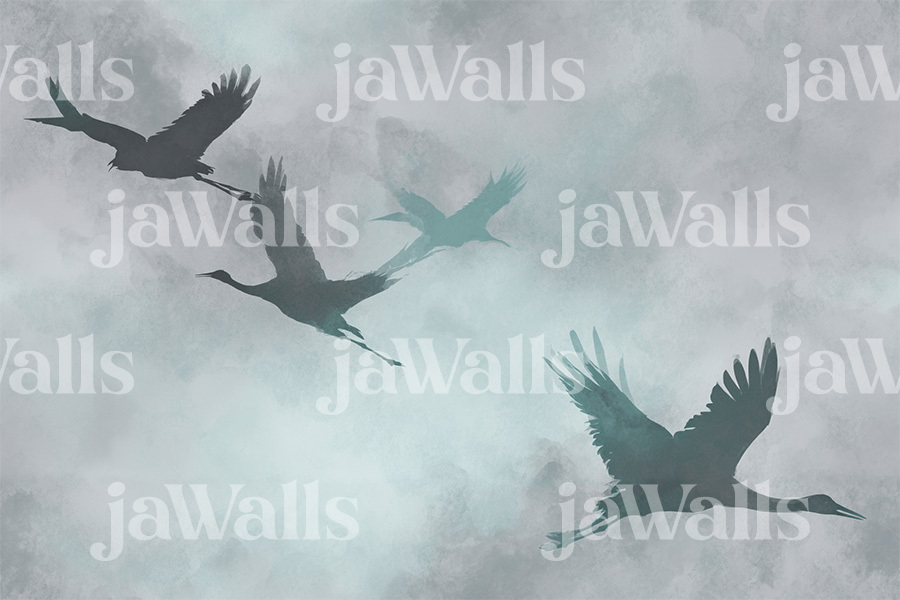 This design captures the quiet majesty of cranes in flight, a symbol of longevity and peace in East Asian art. Graceful crane silhouettes with outstretched wings drift across a calm, misty sky. The birds are rendered with soft, smoky grey and pale beige brushstrokes, their wings subtly dissolving into a background that evokes layers of handmade paper and low-lying clouds. The diagonal flow of the composition creates a sense of serene movement and elegant simplicity, offering a meditative visual experience without a fixed narrative.