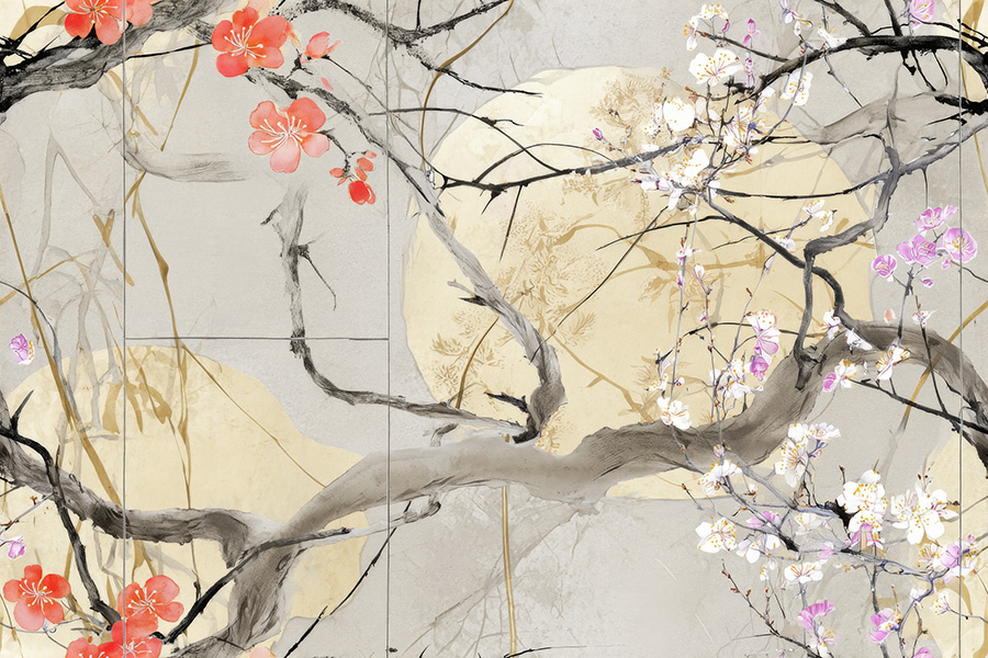This serene design features a blossoming tree, depicted with exquisite detail in the refined style of Chinese art. Set against a light gray background with subtle white grid lines, the tree bursts with delicate flowers in light pink and red, highlighted with accents of gold. The composition is simple yet elegant, emphasizing high definition, precision, and intricate details for a sophisticated and tranquil aesthetic.