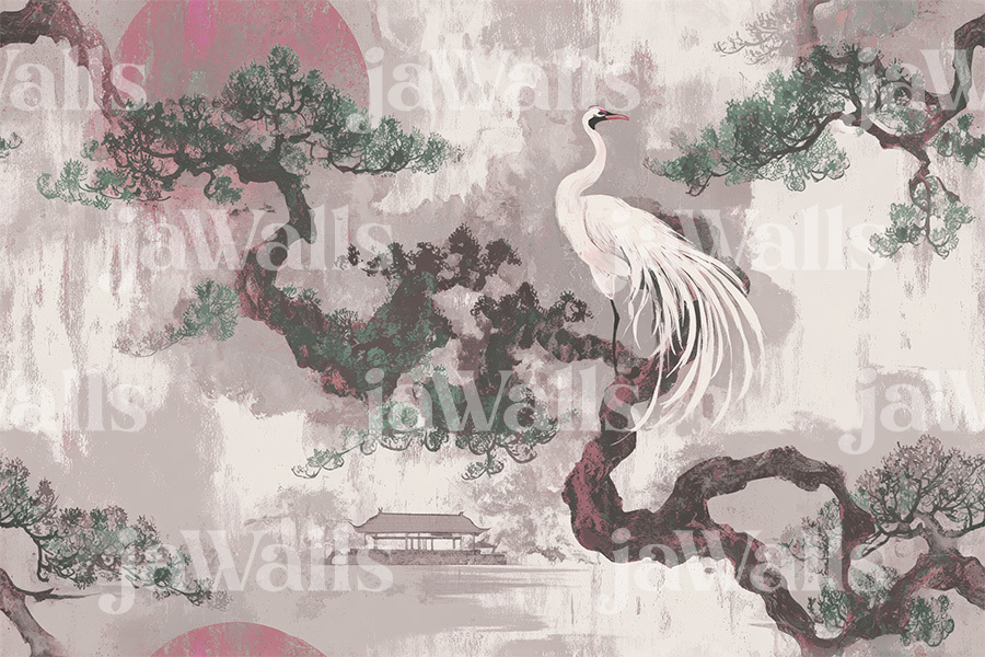 The “Rose Garden” colorway introduces warmth and vitality to the mural, softening the composition while maintaining its contemplative essence. The balance between the crane, the tree, and the botanical details creates an atmosphere of tranquility and renewal. Perfect for living rooms, bedrooms, offices, or boutique interiors, this wallpaper adapts seamlessly to multiple settings.