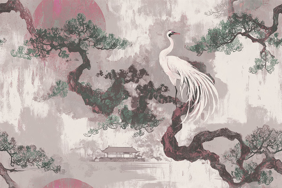 “Silent Flight” offers a mural inspired by Chinese artistry, where a white crane rests on the branch of an ancient tree. The composition includes pine forests, architectural silhouettes, and subtle rays of light that enhance its serene narrative. It is a refined wall covering that combines nature, symbolism, and elegance.